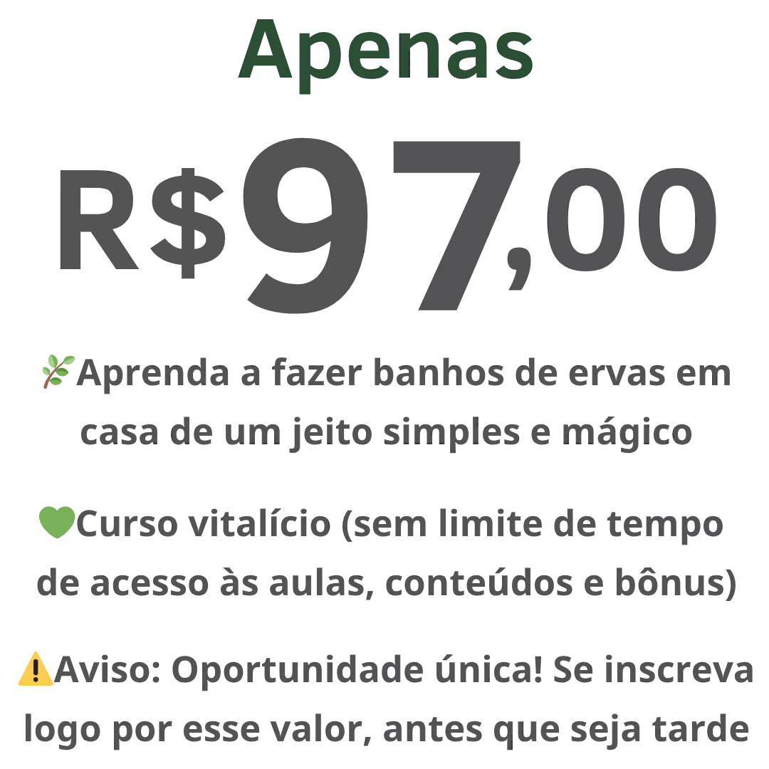 O valor de R$97 é um investimento no seu bem-estar e na sua conexão com a natureza, proporcionando a você as ferramentas necessárias para um equilíbrio físico, emocional e espiritual.